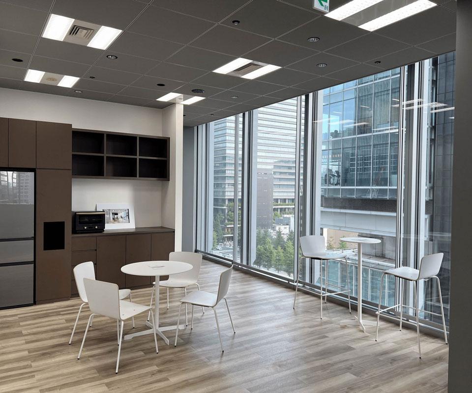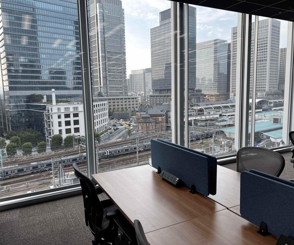 個室オフィスからは、東京駅丸の内駅舎や皇居、そして都心のスカイラインの絶景を一望できます。オフィスおよび会議室は、柔軟なレイアウトデザインが可能で、デスク間の距離にも考慮した空間構成となっております。